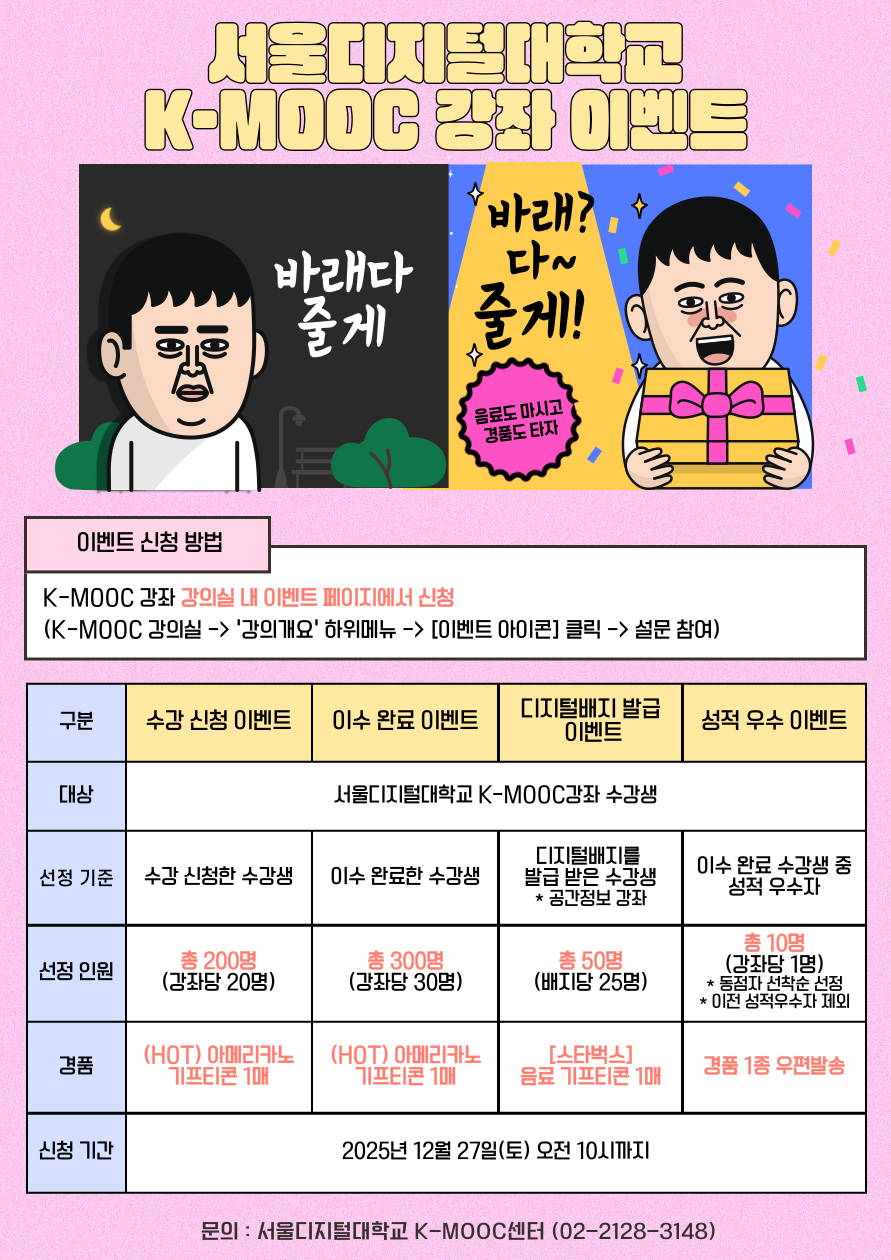 - 서울디지털대학교 2025년 2학기 K-MOOC 강좌 수강 안내 및 이벤트