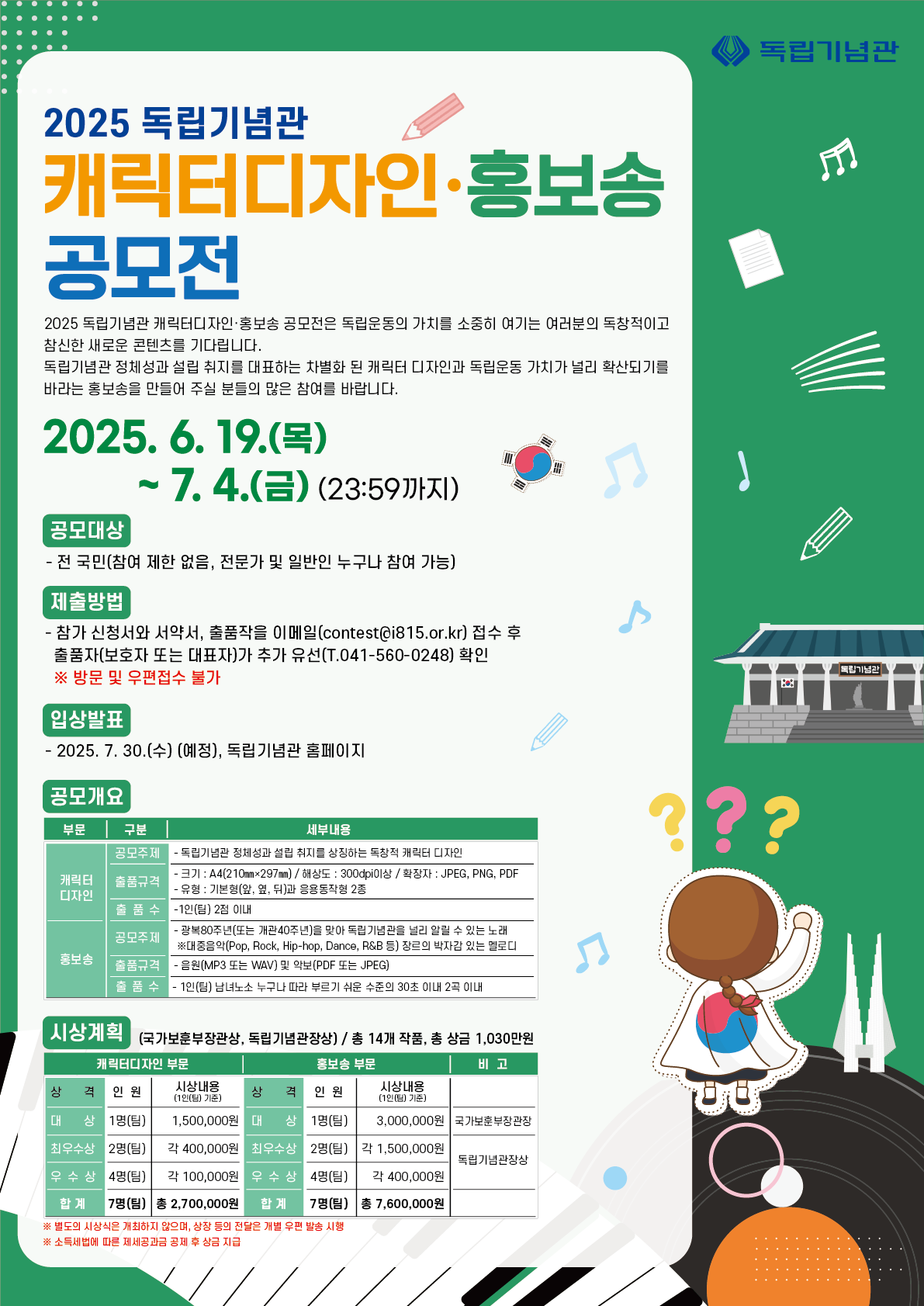 천안 [일반] [공모 안내] 2025 독립기념관 캐릭터디자인/홍보송 공모전 -