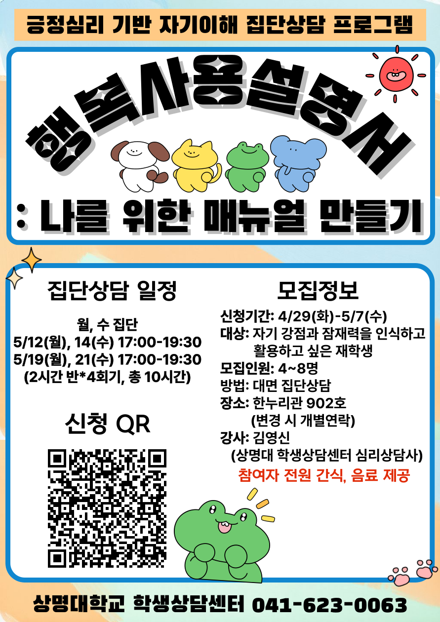 천안 [학생생활] [학생상담센터(천안)] 25-1 자기이해 집단상담 <행복사용설명서: 나를 위한 매뉴얼 만들기> 신청 -
