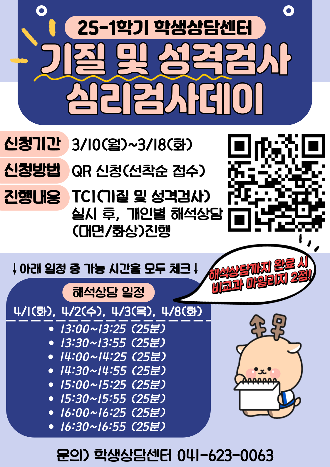 천안 [학생생활] [학생상담센터(천안)] 2025학년도 1학기 ‘기질 및 성격검사’ 심리검사데이 신청 안내 -